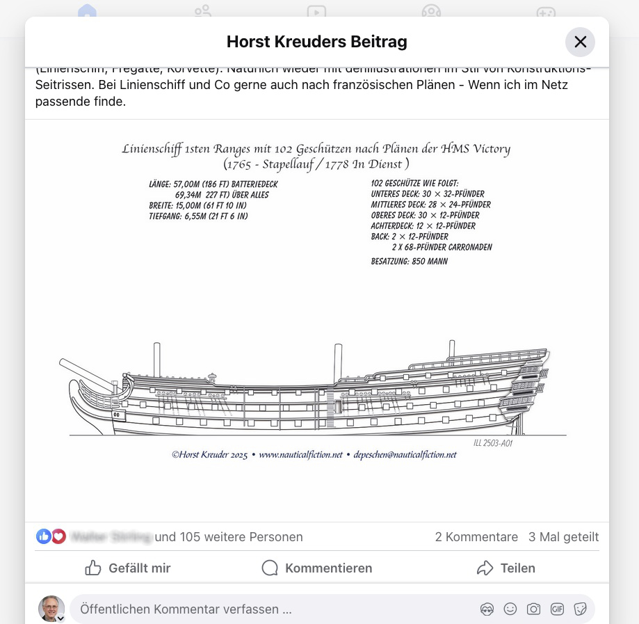 Natürlich zeige ich die Zeichnungen erstmal in meinem persönlichen Account „KreuderHorst“. Aber ich bin auch Mitglied in einigen Gruppen. In „Historische Segelschiffe Modellbau“, habe ich Gelegenheit, die Zeichnungen einem Fachpublikum zu präsentieren, das sich in der Materie auskennt.
