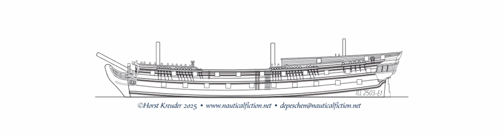 1) Von den klassischen Fünft-Rängern, noch als Linienschiff mit 2 Batteriedecks konzipiert, war zur Zeit Quincey Howards nur noch die Variante mit 44 Geschützen im Einsatz.