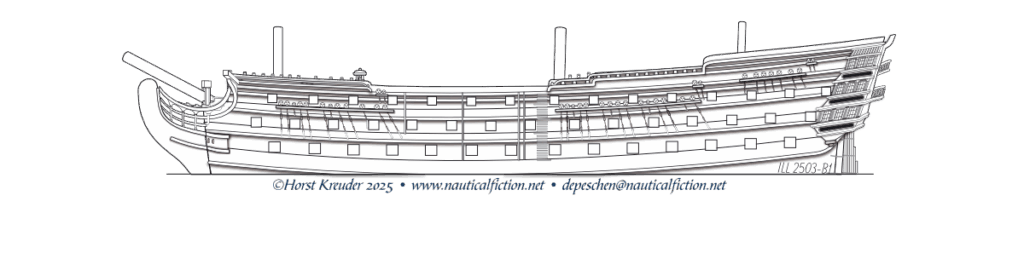 Dies wurde bei der Erstellung des Plans, dem die Illustration nachempfunden ist, noch nicht berücksichtigt. Beim Bau wurde, nach dem Wikipedia-Artikel zur HMS Duke, diese neue Möglichkeit jedoch genutzt. Die Bewaffnungsliste umfaßt bereits die zusätzlichen 12-Pfünder auf dem Achterdeck.